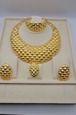 Each piece is masterfully gold-plated with intricate bubble-textured detailing that reflects light beautifully from every angle. The bold necklace sits gracefully on your neckline, paired with matching oval-shaped earrings and a statement bangle that completes your radiant look.