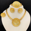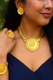 Unleash your inner queen with the Radiant Majesty Gold-Plated Jewelry Set, a timeless expression of elegance and power. Crafted with precision and finished in brilliant 18K gold plating, this four-piece set includes a bold round medallion necklace, matching earrings, a statement bracelet, and a coordinating ring — each piece designed to capture light and admiration from every angle.
