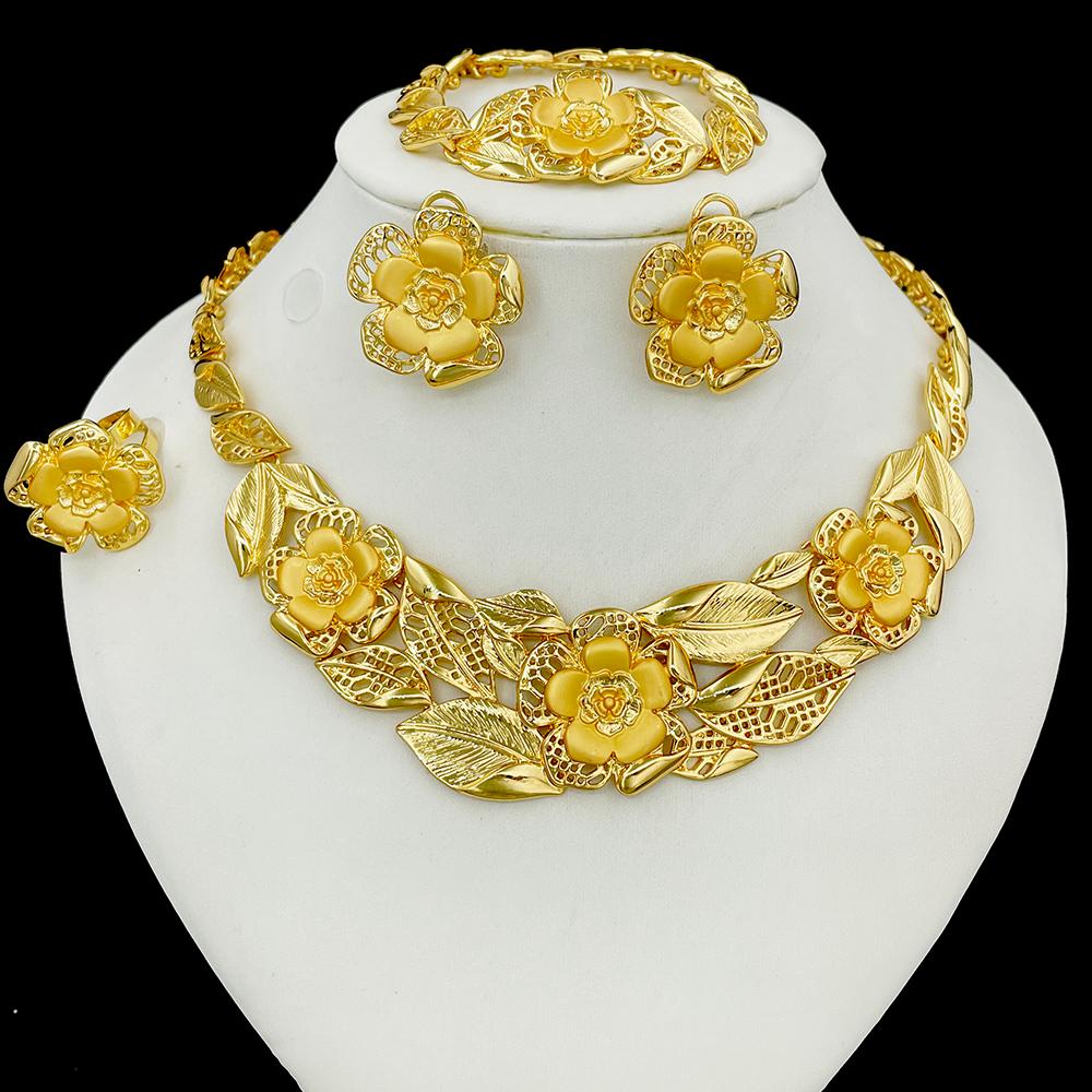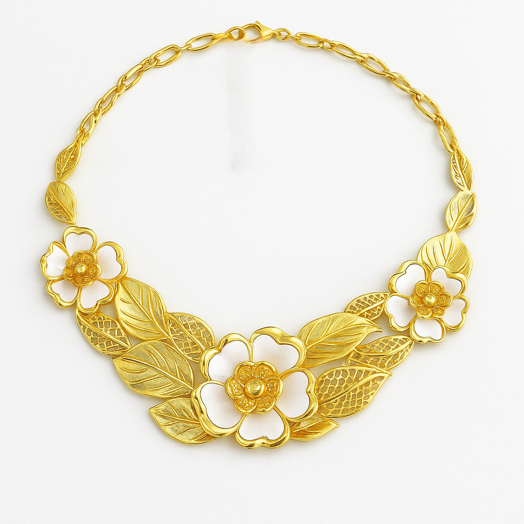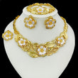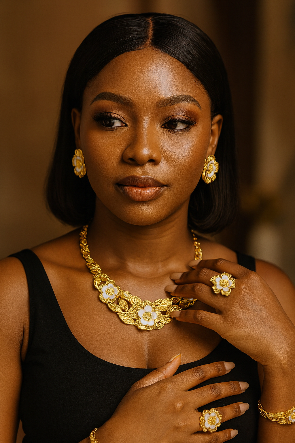 Elevate your style with our Elegant Gold Floral Jewelry Set, crafted with timeless floral details and premium craftsmanship. Perfect for brides, bridesmaids, weddings, proms, parties, and special occasions, this complete set includes a statement necklace, matching earrings, an elegant bracelet, and a coordinating ring. Available in two beautiful color variations, this versatile set is designed to complement any outfit with elegance and sophistication. A must-have jewelry set for women who love luxury and lasting beauty.
