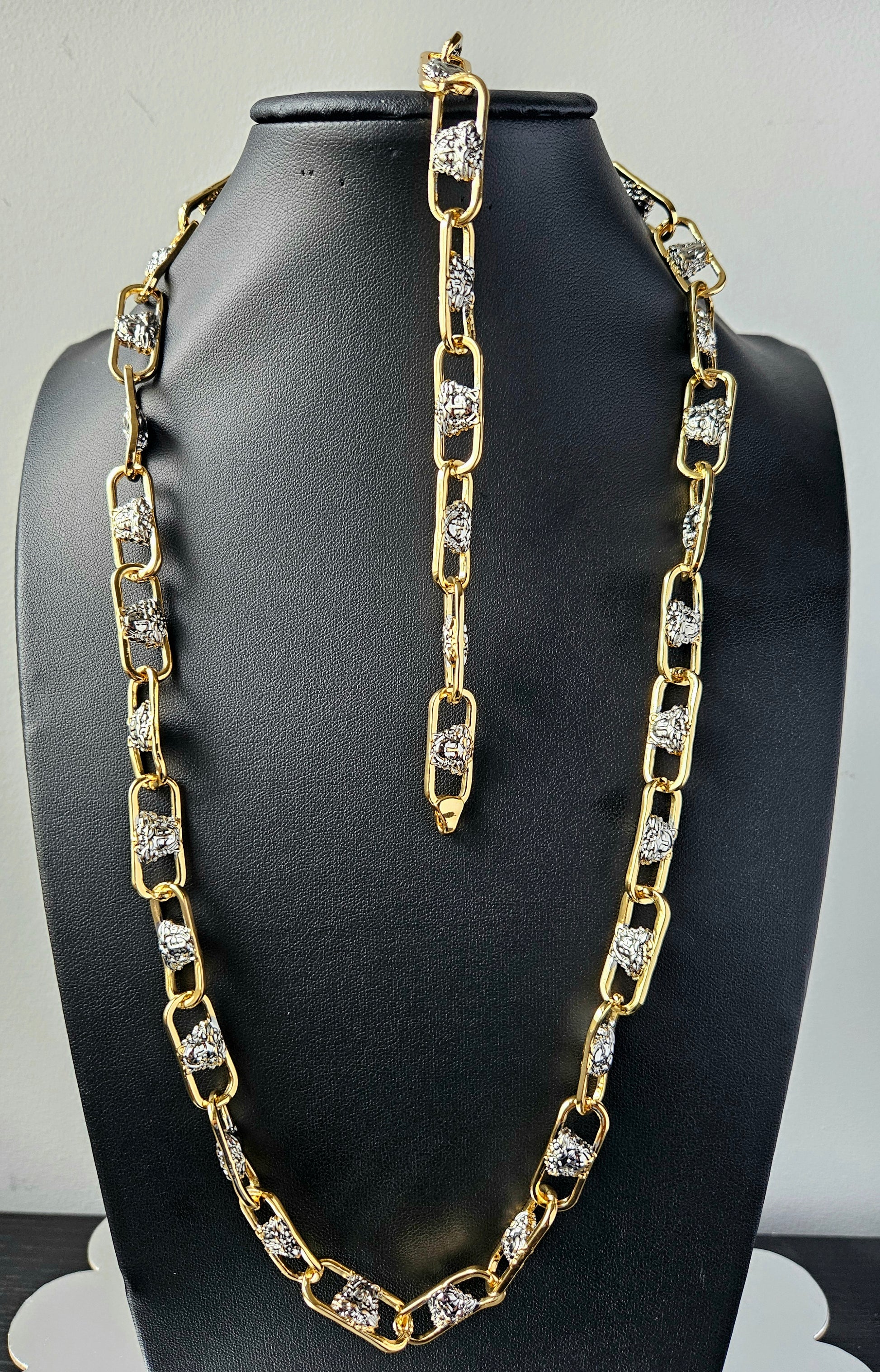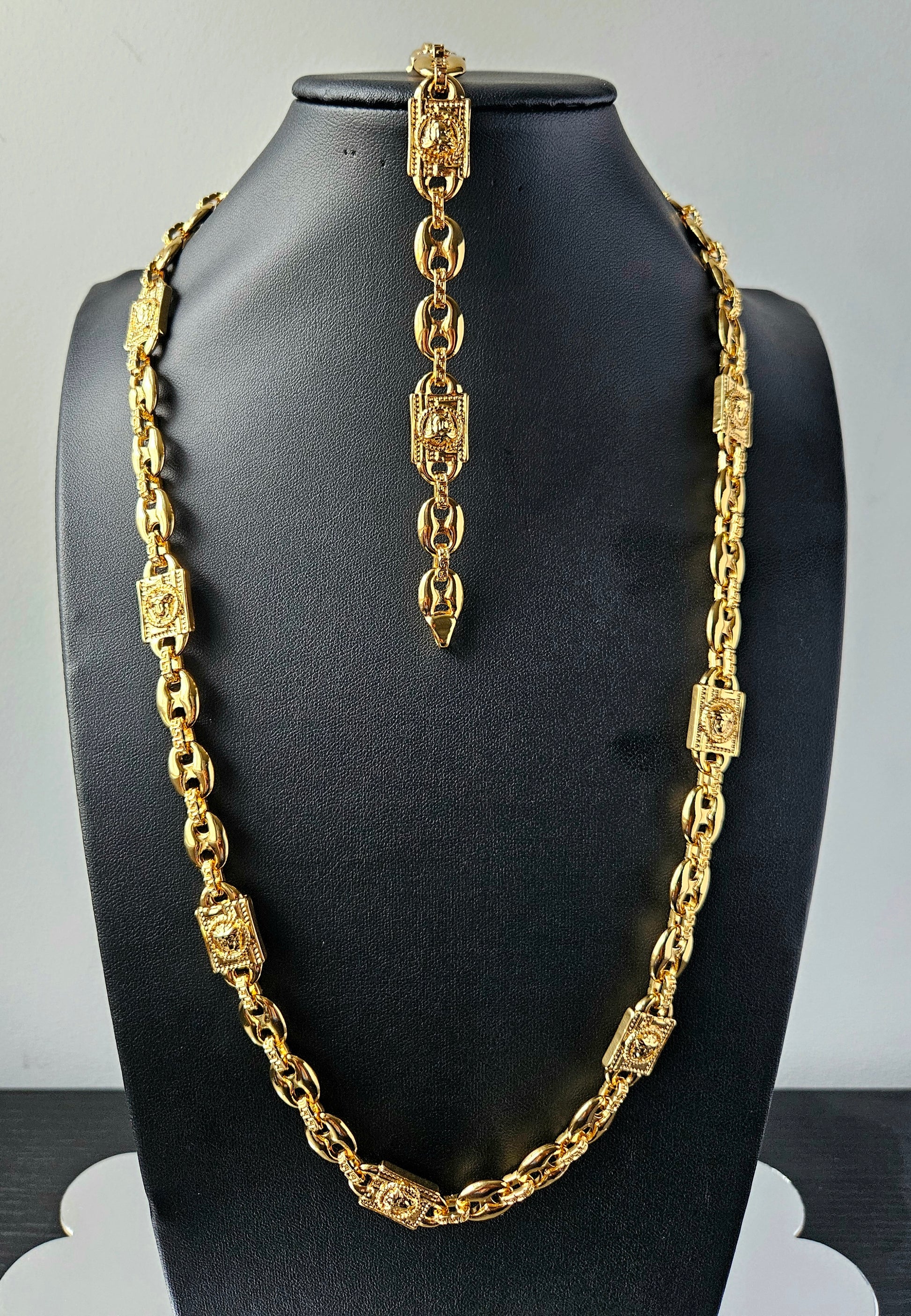 Command attention with the Majestic Empress Gold Necklace & Bracelet Set, a two-piece jewelry ensemble designed to elevate your look with effortless sophistication. Crafted with premium 18K gold plating, this set includes a bold statement necklace and a perfectly matching bracelet, both showcasing intricate detailing that radiates luxury.
